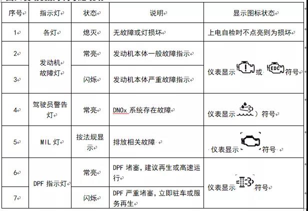 國六發(fā)動(dòng)機(jī)指示燈狀態(tài)說明: