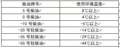 為了使發(fā)動(dòng)機(jī)擁有更高的可靠性和更好的經(jīng)濟(jì)型,柴油應(yīng)選用符合19147-2018國六標(biāo)準(zhǔn)的正規(guī)柴油,并隨著地區(qū)環(huán)境氣溫的不同而選用不同牌號的清潔柴油。根據(jù)使用環(huán)境氣溫,按下表選用不同牌號的清潔柴油:
