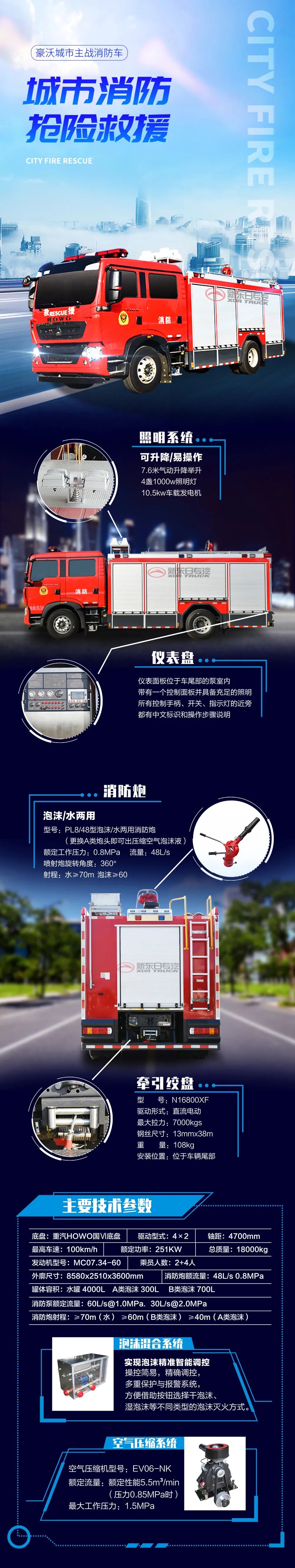 豪沃單橋城市主戰(zhàn)消防車采用中國重汽集團濟南卡車股份有限公司生產(chǎn)的ZZ5207TXFV471GF5型二類汽車底盤, 該車原裝雙排駕駛室,可載含駕駛員在內(nèi)的乘員6人,駕乘舒適輕便。該車采用DC-CAFS60/45M型集成壓縮空氣泡沫滅火系統(tǒng),該壓縮空氣泡沫系統(tǒng)操控簡易,泡沫生成實現(xiàn)即時全自動微機精確調(diào)控,并設(shè)多重保護與報警系統(tǒng),消防作戰(zhàn)員可依據(jù)復雜的火場情況,方便地借助按鈕選擇干泡沫、濕泡沫等不同類型的泡沫滅火方式。該套系統(tǒng)不僅裝有A類泡沫原液,還裝有B類泡沫原液,可高效率地撲滅和控制A、B類物質(zhì)火災,并具備良好的環(huán)保性能。另外該車配置有牽引電動絞盤,7.6米氣動升降舉升4*1000w照明燈和10.5kw車載發(fā)電機,使得該車還可獨立開展偵查、破拆、救生、照明、防護等綜合搶險救援功能。